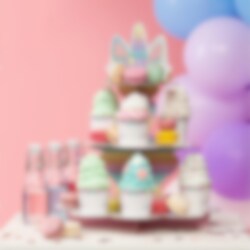 Creëer magie op je feest met deze eenhoorn cupcakestandaard! Met drie lagen en een sprookjesachtig eenhoornontwerp is het een betoverende toevoeging aan de desserttafel. Perfect voor muffins, cupcakes of andere lekkernijen. De standaard is 41 cm hoog en 34 cm breed en geeft elke eenhoorn-thema party een magische uitstraling!