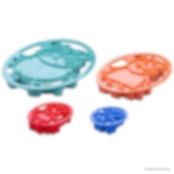 De set bevat vier verschillende maten: Daddy Pig (14 x 12,5 x 2 cm), Mummy Pig (11,5 x 10 x 2 cm), Peppa Pig (6,5 x 5,5 x 2 cm) en George Pig (4,5 x 4,5 x 2 cm), allemaal gemaakt van duurzaam plastic.