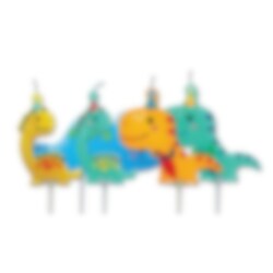 5 taartkaarsjes met kleurrijke dinosaurussen die klaar zijn om te feesten. Versier de taart hiermee als het tijd is voor het dinosaurus kinderfeestje. De kaarsjes zijn ongeveer 5 cm hoog.