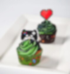 12 stuks muffindecoraties met grappige videospel-afbeeldingen. Perfect om de muffins te versieren als er een kinderfeestje is met een leuk videospelthema.
