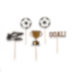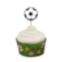 12 stuks prikkers met voetbalgerelateerde afbeeldingen in de kleuren zwart, wit en goud. Maak je muffins, cupcakes of ander lekkers extra leuk en stijlvol voor het kinderfeestje met een sportief voetbalthema.