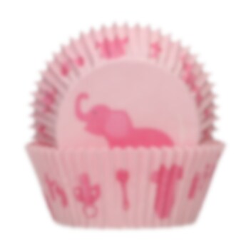 48 lichtroze muffinvormpjes met een schattig motief van een olifant. Leuk voor feestjes en babyshowers.