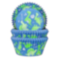 50 stuks muffinvormpjes in blauw met afbeeldingen van verschillende dinosaurussen in groen. Gebruik deze om geweldige muffins te bakken voor het dinosaurus kinderfeestje. De muffinvormpjes hebben een bodemdiameter van ongeveer 5 cm.