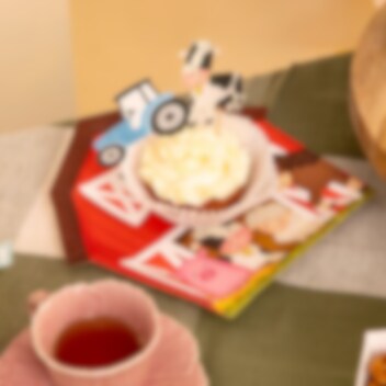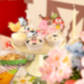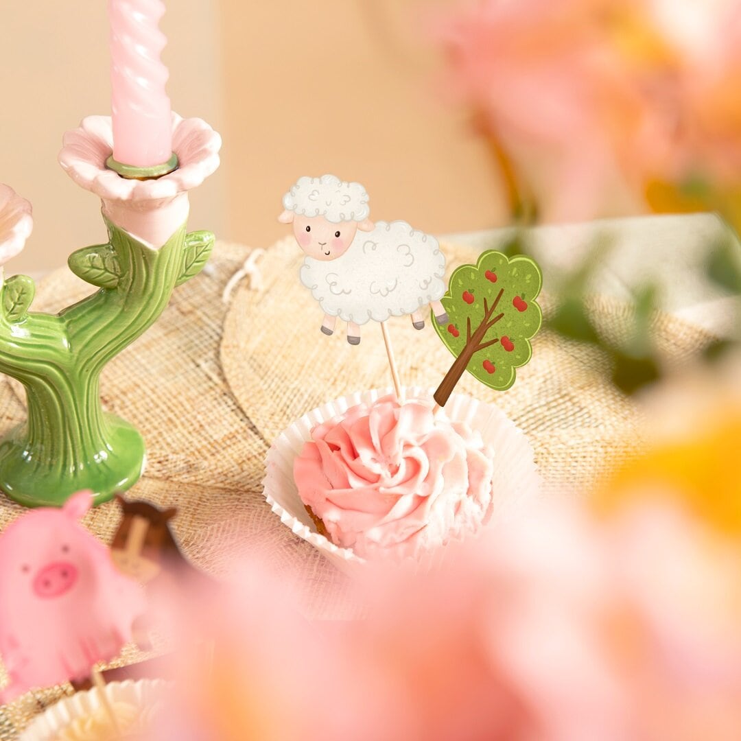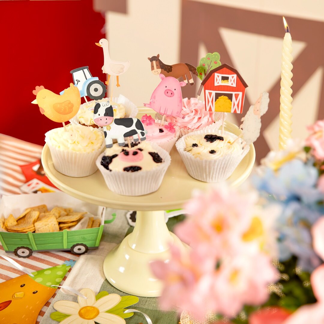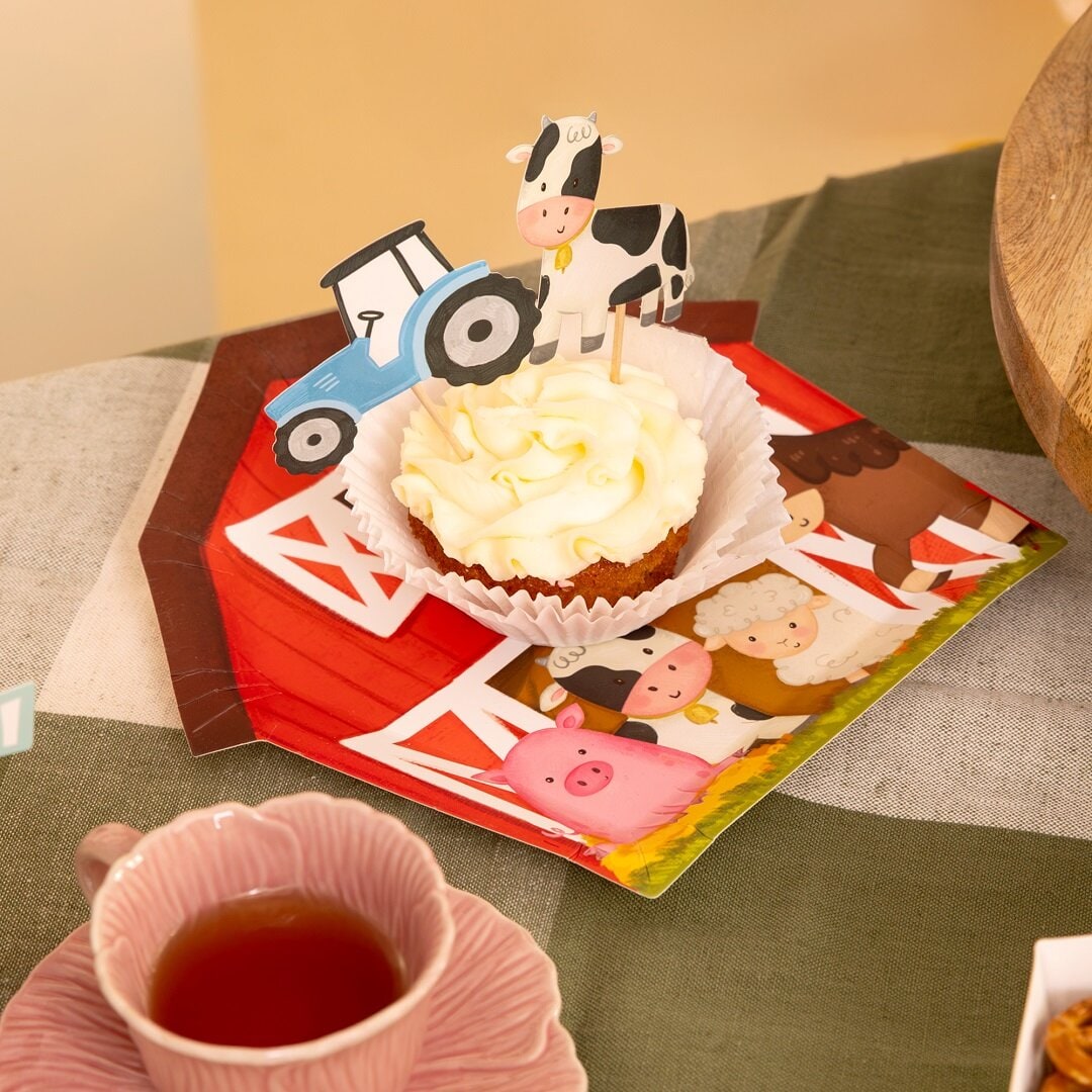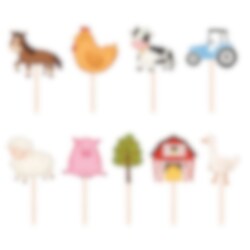9 taartdecoraties met boerderijthema die de taart, cupcakes of andere lekkernijen extra feestelijk maken voor het kinderfeestje. De set bevat verschillende schattige afbeeldingen zoals een paard, kip, koe, tractor, schaap, varken, boom, schuur en gans, wat perfect past bij een kinderfeestje met boerderijthema.