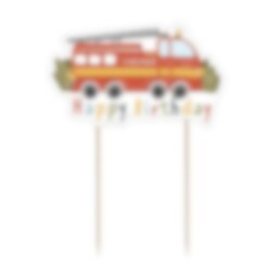Cake Topper met een motief van een brandweerwagen en de tekst "Happy Birthday" in vrolijke kleuren. Hoogte 19 cm.