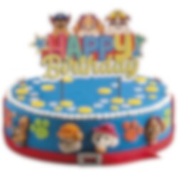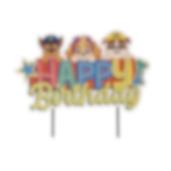 Caketopper van karton met de tekst "Happy Birthday" en vrolijke afbeeldingen van Paw Patrol. Hoogte: ca. 14,5 cm.