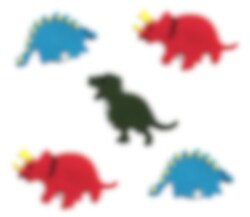 5 stuks suikerdecoraties die dinosaurussen voorstellen. Versier hiermee de muffins of de taart als het kinderfeestje is.