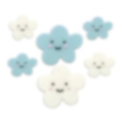 6 stuks suikerdecoratie met schattige wolkjes in de kleuren blauw en wit. Leuk om de taart mee te versieren voor het kinderfeestje.