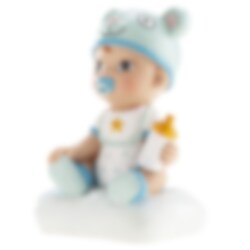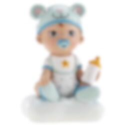 Deze schattige taartdecoratie stelt een kleine babyjongen voor die op een blauw kussen zit en een flesje in zijn hand houdt. Perfect voor het decoreren van taarten bij doopfeesten, naamgevingen of babyshowers.