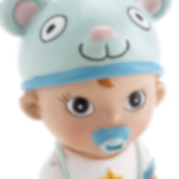 Taartdecoratie - Baby in blauw met flesje 9 cm