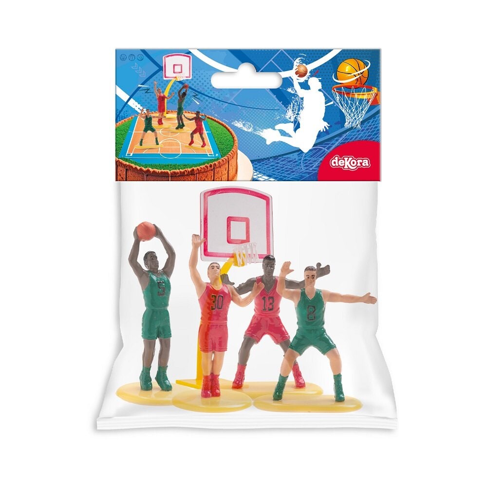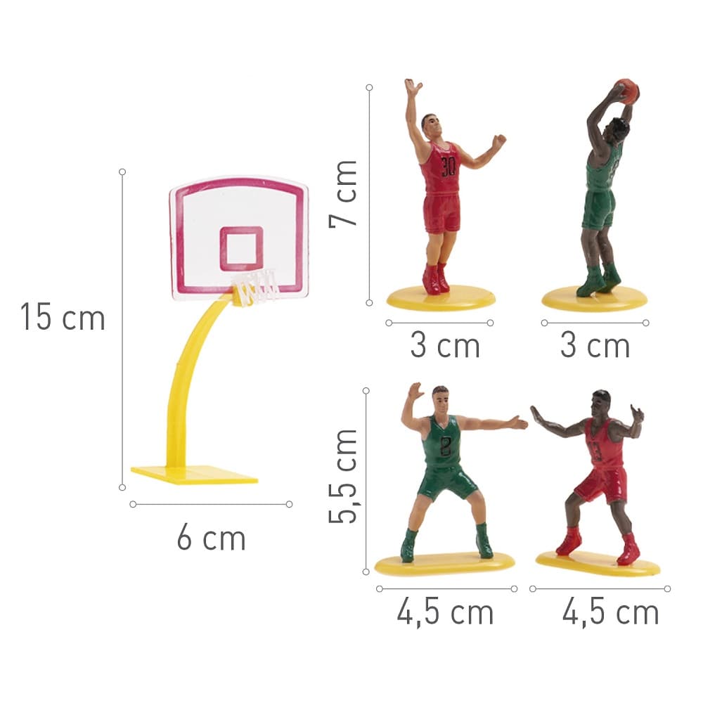 De set bevat een basketbalmand en vier basketbalspelers in verschillende posities die direct op de taart worden geplaatst. De basketbalmand is ongeveer 15 cm hoog en de spelers zijn ongeveer 5,5–7 cm hoog, waardoor ze een echt blikvanger op de taart zijn. Perfect voor een sportief kinderfeestje, een basketbalfeestje of voor iedereen die van basketbal houdt.