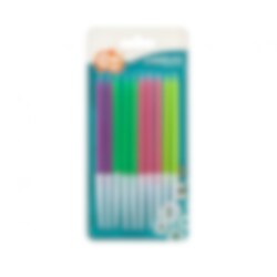 10 taartkaarsen in felle neonkleuren. De taartkaarsen zijn 13,5 cm hoog en zijn ideaal voor themafeesten en kinderfeestjes.