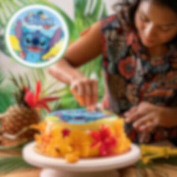 Taartprint van fondant met een schattige afbeelding van Stitch. De taartprint is klaar om direct op de taart te plaatsen en heeft een scherper resultaat dan een ouwelprint. Bovendien heeft de print een heerlijke vanillesmaak. De taartprint heeft een diameter van ca. 20 cm.