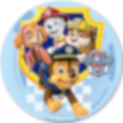Kleurrijke taartprint van suikervrije fondant met afbeeldingen van de karakters uit de tv-serie Paw Patrol van Nickelodeon. De taartprint is klaar om direct op de taart te worden geplaatst. De taartprint heeft een diameter van ongeveer 20 cm.