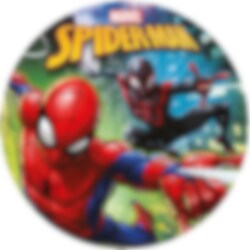 Kleurrijke taartprint van heerlijke suikervrije fondant met een afbeelding van Spiderman. De taartprint is klaar om direct op de taart te plaatsen en heeft een scherpere print dan een ouwelprint. De taartprint heeft een doorsnee van ongeveer 20 cm.