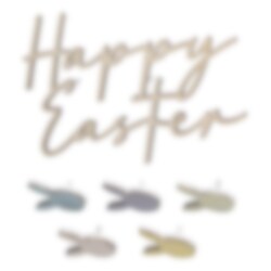 Zet de puntjes op de i van je paasviering met deze "Happy Easter" taartdecoratie van hout. Naast het bord zijn er ook vijf schattige houten konijnenhoofden inbegrepen.