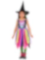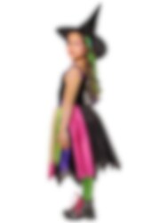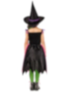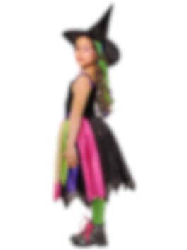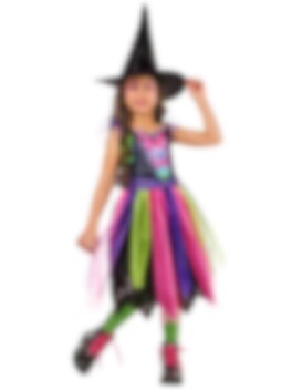 Laat je kind zich omtoveren tot een magisch en kleurrijk heksje! Dit speelse kostuum bestaat uit een glinsterende jurk in felle kleuren zoals roze, paars en limoengroen, met meerdere lagen tule voor extra volume. De meegeleverde puntige heksenhoed maakt de look helemaal af - perfect voor Halloween.