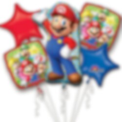 Stoer ballonboeket in het thema Super Mario. Versier de feestzaal hiermee om een gezellige sfeer te creëren. De verpakking bevat 5 stuks ballonnen. 1 supergevormd in de vorm van Mario (55 x 83 cm), 2 in de vorm van sterren (48 cm) en 2 vierkante ballonnen (43 cm). Kan worden opgeblazen met lucht of helium.