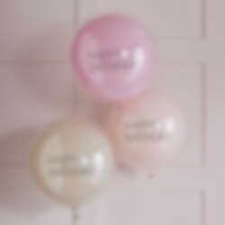 3 stuks stijlvolle ballonnen met dubbele lagen in de tinten roze, ivoor en perzik en met de tekst Happy Birthday. Mooi om te hebben als het tijd is om te versieren voor je verjaardag! De ballonnen kunnen worden opgeblazen met lucht of met helium en hebben een diameter van ongeveer 45 cm wanneer ze volledig zijn opgeblazen.