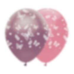 6 latex ballonnen in de kleuren lichtroze en paars met schattige vlindermotieven in wit. Perfecte decoratie voor elk kinderfeestje. De ballonnen hebben in opgeblazen toestand een diameter van 30 cm en kunnen worden opgeblazen met lucht of helium.