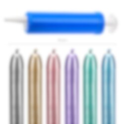Opgeblazen zijn de ballonnen ongeveer 5 x 130 cm.
