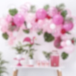 Chique ballonnenboog in roze tinten die je zelf bouwt. Een ontzettend mooie decoratie die geschikt is voor kinderfeestjes, feestjes of bruiloften. De verpakking bevat in totaal 70 stuks ballonnen in verschillende maten en accessoires. De ballonnenboog is ongeveer 4 meter lang.