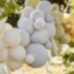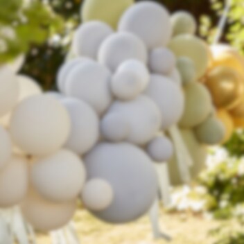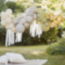 Mooie ballonboog in groen- en goudtinten met bijbehorende decoratieve palmbladeren die je zelf bouwt. Een werkelijk indrukwekkende decoratie die geschikt is voor kinderfeestje, feestje of babyshower. De verpakking bevat in totaal 70 stuks ballonnen in verschillende maten en accessoires. De ballonnenboog is ongeveer 4 meter lang.