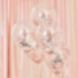 5 stuks mooie transparante ballonnen gevuld met glinsterende roségouden confetti. De ballonnen kunnen worden opgeblazen met lucht of met helium en hebben een diameter van ongeveer 30 cm wanneer ze volledig zijn opgeblazen.