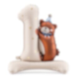 Deze mooie vrijstaande folieballon stelt het cijfer 1 voor, omhelst door een schattige teddybeer. Perfect om een feestelijke en charmante sfeer te creëren voor de eerste verjaardag!