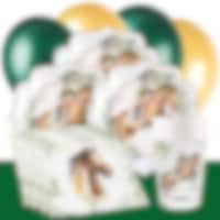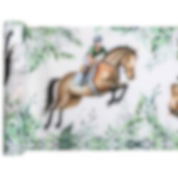 Stijlvolle tafelloper met afbeeldingen van renpaarden en ruiters. Perfect om de tafel mee te dekken voor een kinderfeestje met een paardenthema.