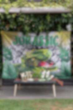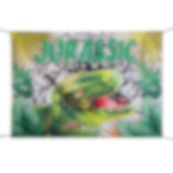 Grote wanddecoratie of achtergrond voor je kinderfeestje met dinosaurus-thema. De decoratie verhoogt de sfeer aanzienlijk en kan ook als fotobackground worden gebruikt. Wie wil er geen stoere foto's maken voor een T-Rex?
