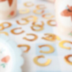 Mooie confetti van goudfolie in de vorm van hoefijzers. De confetti heeft een diameter van 2 cm. Het zakje bevat 15 gram.
