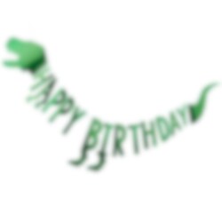Stoere slinger in groene folie met de tekst "Happy Birthday" en afbeeldingen van verschillende delen van dinosaurussen. Hang deze op de muur voor een dino-feestje. De slinger is ongeveer 2 meter lang.