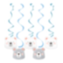 5 hangende whirls decoraties in blauwtinten met motieven van grijze en witte beren. Een leuke decoratie voor het kinderfeestje met een beren thema. 2 van de decoraties zijn ongeveer 99 cm lang en 3 van de versieringen zijn ongeveer 76 cm lang.