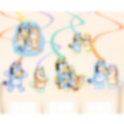 6 hangdecoraties in verschillende kleuren met afbeeldingen van Bluey's levendige familie. De versieringen zijn 60 cm hoog en hebben aan beide zijden afbeeldingen.