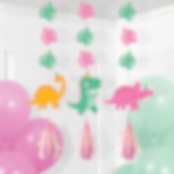 3 hangende decoraties met bijbehorende kwastjes in leuke kleuren en afbeeldingen van schattige dino's en bladeren. Een indrukwekkende decoratie voor je dinosaurus kinderfeestje. De decoraties zijn ongeveer 91 cm lang en de afbeeldingen zijn ongeveer 17 cm groot.