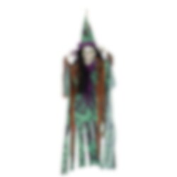 Creëer een griezelige sfeer met deze hangende heks voor Halloween! De figuur is 60 cm lang en heeft een angstaanjagende look met hoed, haar en gescheurde kleren die bewegen wanneer ze hangt. Perfect om bij de ingang, in een boom of als onderdeel van je binnendecoratie te gebruiken om gasten en trick-or-treaters te verrassen.