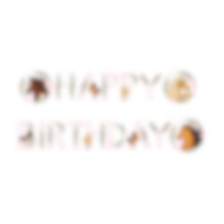 Kartonnen slinger in wit en roze met de tekst 'Happy Birthday' en afbeeldingen van paarden en bloemen. Een mooie decoratie om op te hangen voor een paarden-kinderfeestje.