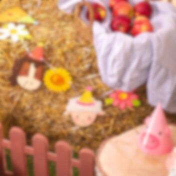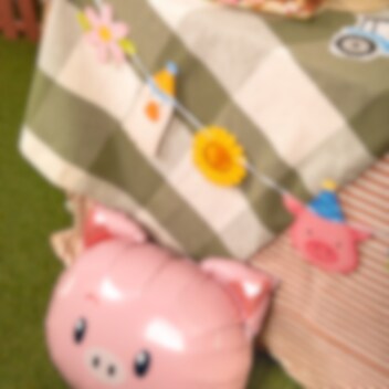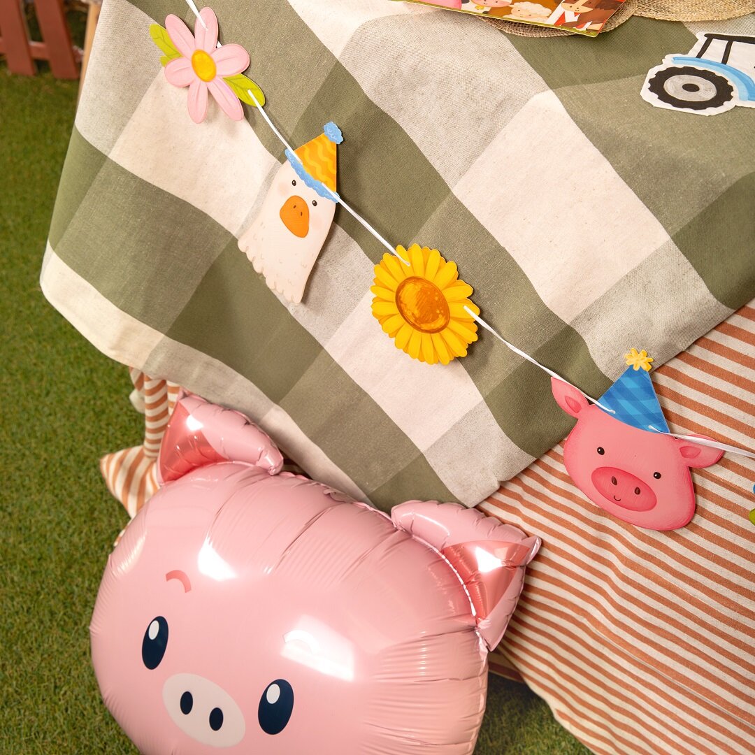Papieren slinger met schattige boerderijdieren en bloemen die een charmante decoratie vormen voor het kinderfeestje. De speelse afbeeldingen met kip, paard, schaap, gans, varken, koe en kleurrijke bloemen zijn perfect om een warme en feestelijke sfeer te creëren voor een kinderfeestje met een boerderijthema.