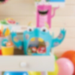 Mooie tafeldecoratie van karton met plastic raam dat een schattig monster voorstelt dat je kunt vullen met snoep of kleine cakejes. Een passende decoratie voor je kinderfeestje met Halloween-thema. De decoratie is 23 x 37 x 13 cm groot.