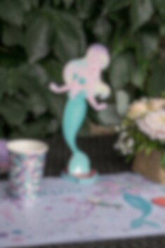 Mooie tafeldecoratie in hout met een mooie zeemeermin. Een prachtige decoratie en detail die perfect past op de gedekte tafel. Het figuur zit op een houten plank waardoor het stabiel staat en na het kinderfeestje kan het worden gebruikt als een interieurdetail in de kinderkamer.