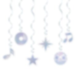 Laat deze schitterende hangdecoraties net zo zweven als de danspassen op de dansvloer. Met sterren, muzieknoten, platen en discoballen van glanzende folie zorgen ze voor een feestelijk effect vol beweging en glamour. Elke spiraal is 85 cm lang en de decoraties zijn tussen de 15 en 18 cm groot – perfect voor aan het plafond of in een deuropening.