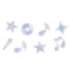 Creëer een sprankelend decor met deze feestelijke discoslinger. De sterren, muzieknoten, discoballen en microfoons met holografische glans maken hem perfect voor aan de muur, op tafel of als achtergrond voor foto’s. De slinger is 110 cm lang en de decoraties zijn ongeveer 12–14 cm groot – ideaal om direct de juiste feeststemming neer te zetten.