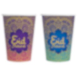 8 papieren bekers die een gouden randje geven aan je Eid-tafelschikking! Met hun elegante ontwerp in blauw, paars en goud worden ze een stijlvol element op de feestelijke gelegenheid. Perfect voor zowel warme als koude dranken. De bekers zijn ongeveer 10 cm hoog en hebben een inhoud van 210 ml.
