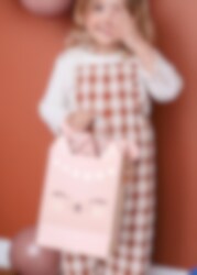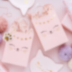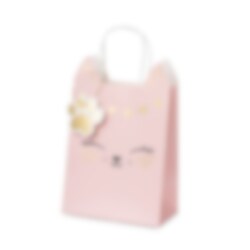 Cadeauzakje in roze met gouden details die opvallen door hun mooie ontwerp van een schattig kattengezicht. Het zakje heeft twee handvatten, is gemaakt van papier en is 10 x 18 x 25 cm groot.