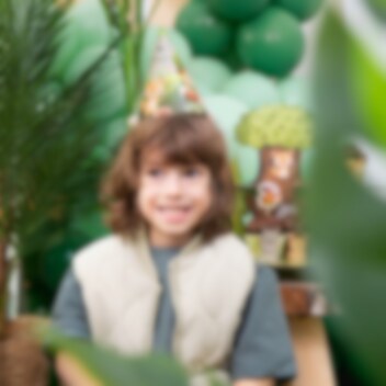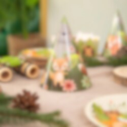 6 feesthoedjes in mooie kleuren met schattige afbeeldingen van bosdieren, perfect voor een kinderfeestje met bosthema.