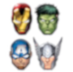 6 maskers die de Hulk Thor, Captain America en Iron Man voorstellen. Gebruik deze zodat jij en je vrienden zich kunnen verkleden als hun favoriete helden. De maskers zijn gemaakt van papier en worden op hun plaats gehouden met een elastische band.