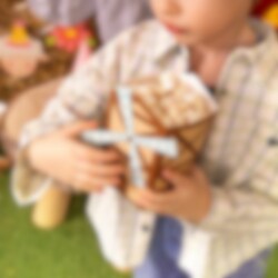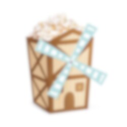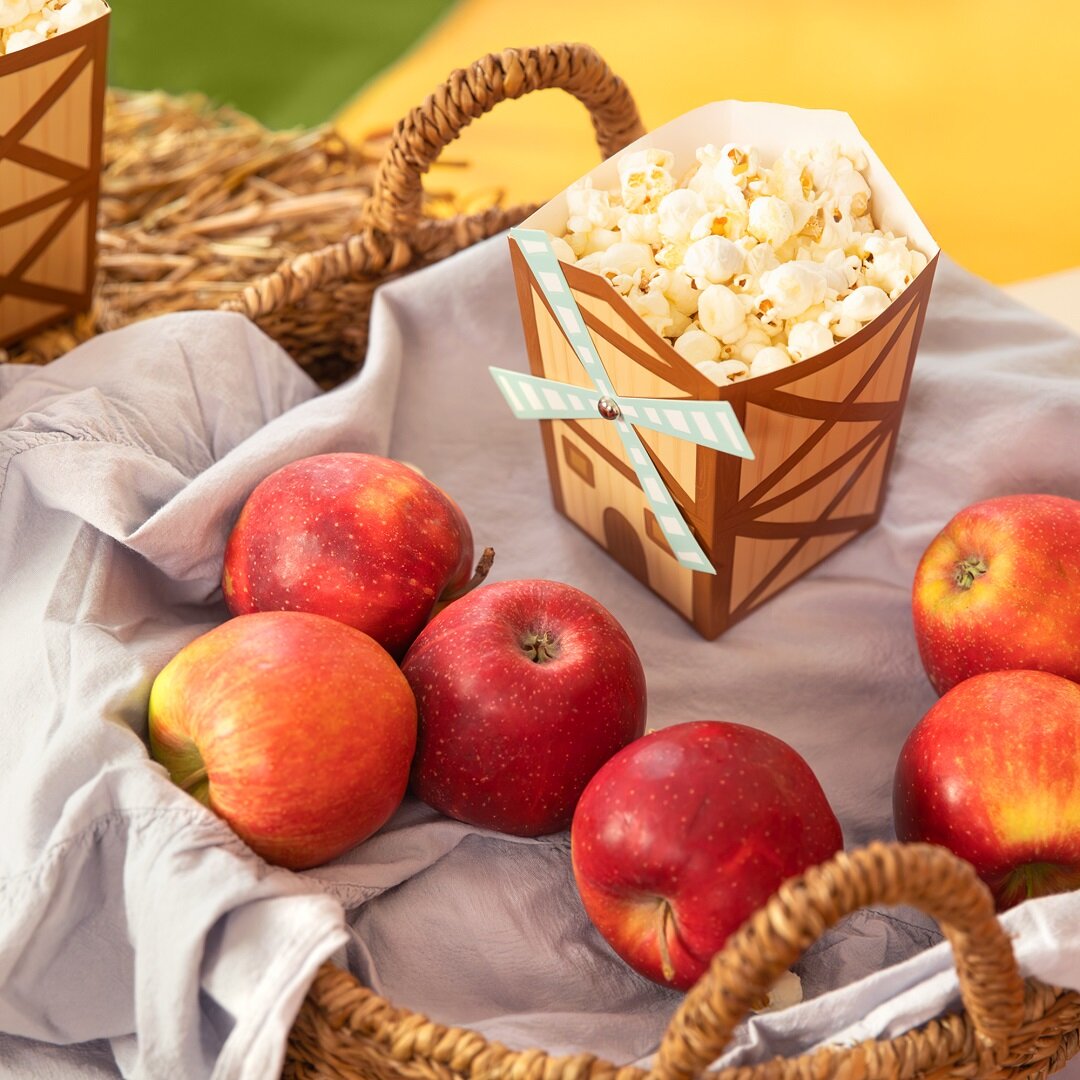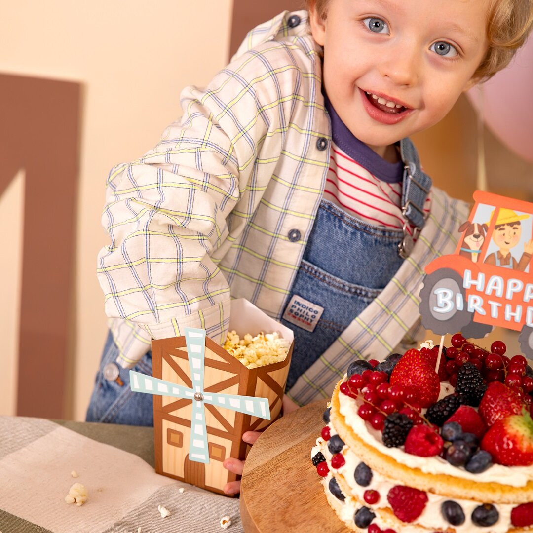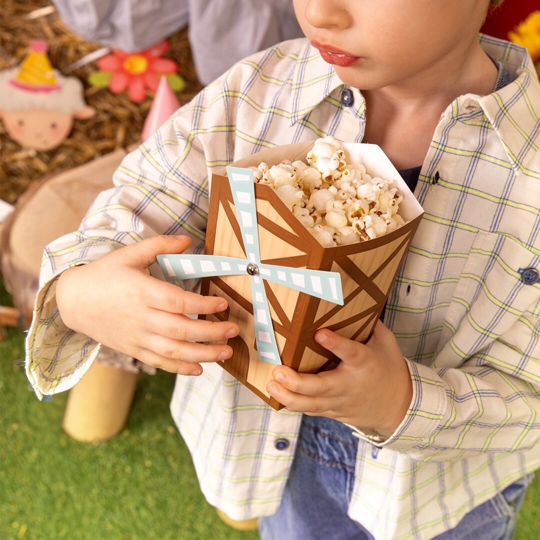 6 popcorn bakjes met boerderijthema die een speels en decoratief detail vormen op de feesttafel. De bakjes zijn gevormd als kleine molentjes en passen perfect bij een kinderfeestje met boerderijthema, terwijl ze het serveren extra leuk maken.
