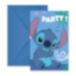 6 blauwe uitnodigingen met een schattige afbeelding van Stitch uit Disney’s populaire film Lilo & Stitch. De uitnodigingen zijn ca. 14 x 8 cm groot en worden geleverd inclusief 6 blauwe enveloppen.