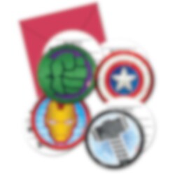 6 ronde uitnodigingskaartjes met vier verschillende ontwerpen van de Avengers. De kaartjes zijn ongeveer 12 cm in doorsnee en alle tekst is in het Engels. Het pakket bevat ook 6 stuks rode enveloppen.
